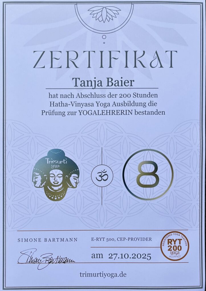 Meine Ausbildung zur zertifizierten Yogalehrerin (Yoga Alliance, 200h Multi-Style) basiert auf international anerkannten Standards – für eine fundierte, ganzheitliche und qualitativ hochwertige Praxis.